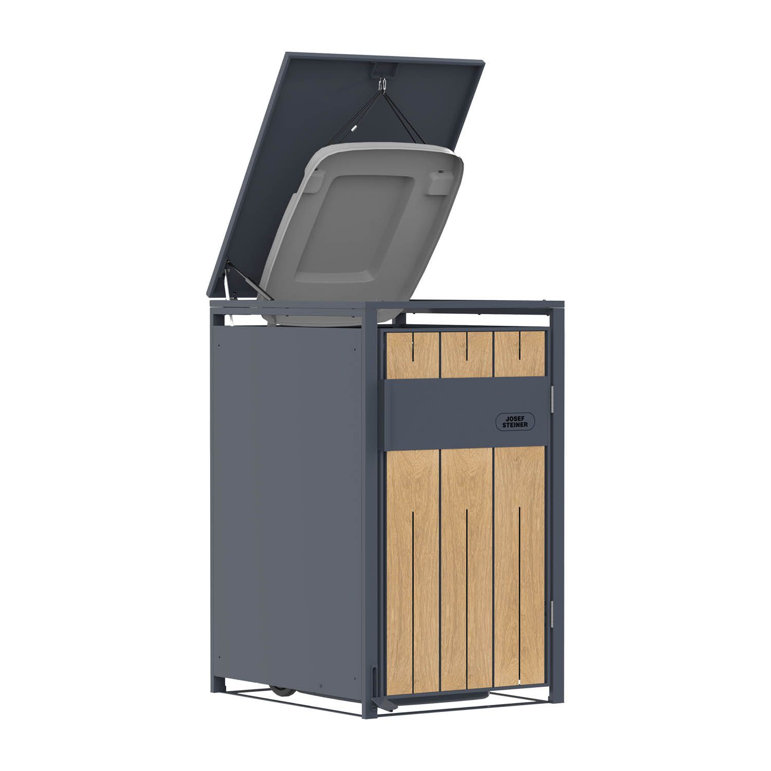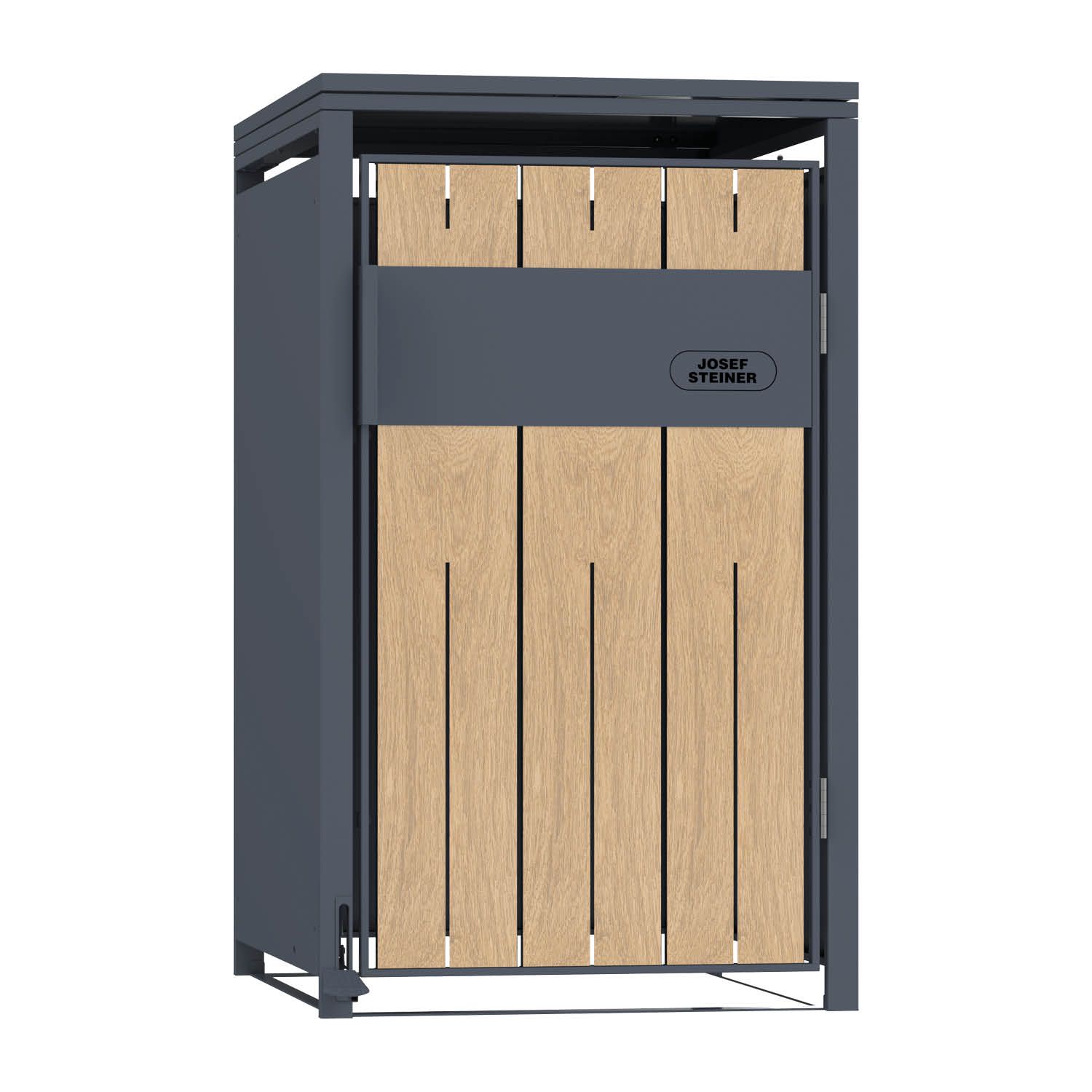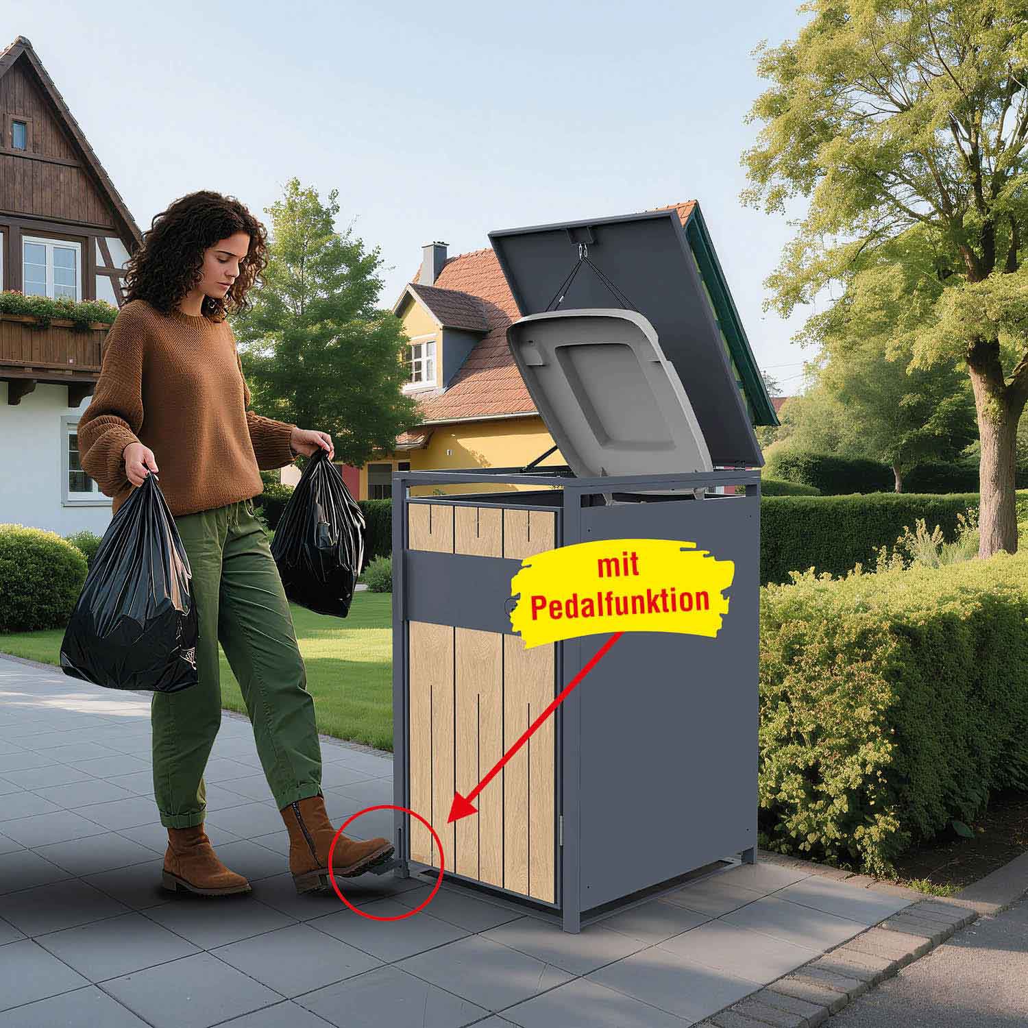 Mülltonnenbox 1-flügelig mit Pedalfunktion - Farbe: anthrazit & Holzoptik, Breite: 68 cm, Höhe: 116 cm, Tiefe: 80 cm