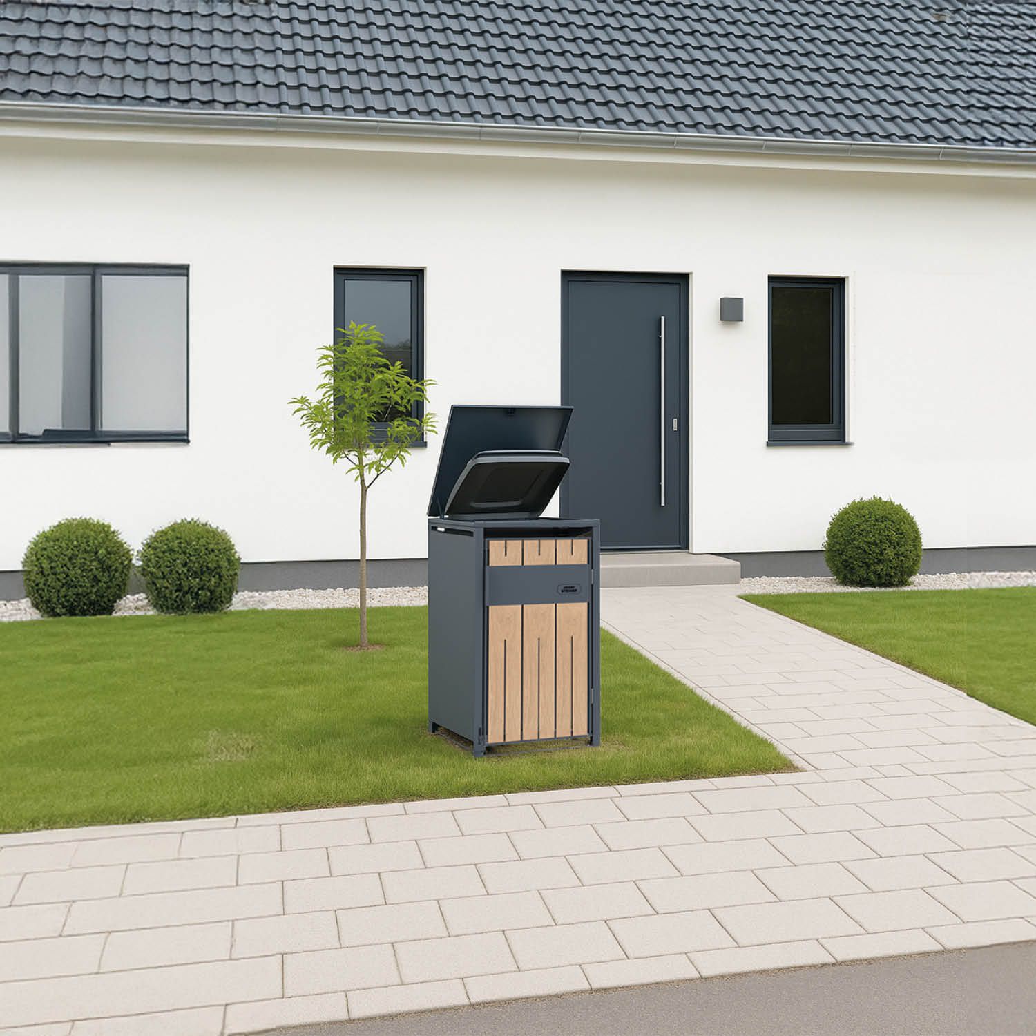 Praktisch, robust und stilvoll: Unsere Mülltonnenbox aus verzinktem, beschichtetem Stahl bietet Platz für eine Mülltonne (120 oder 240 Liter) und überzeugt mit cleverer Pedalfunktion. Durch einfaches Betätigen des Fußpedals öffnet sich der Deckel der Box – und automatisch auch der Deckel der Mülltonne.